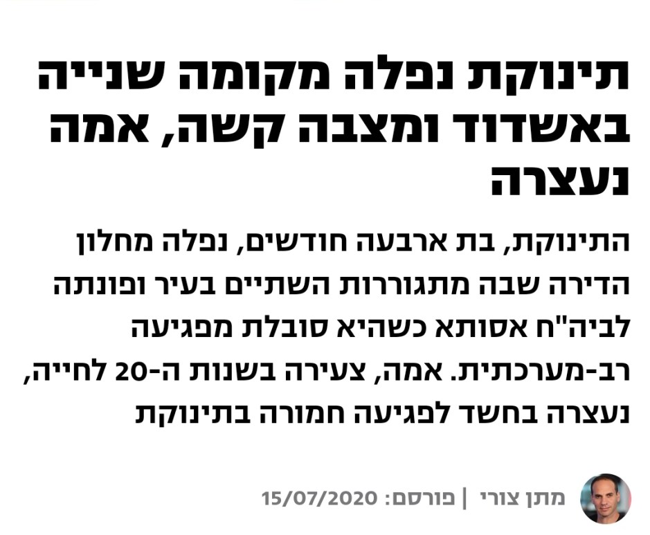 נסיון רצח של תינוקת אמא , מאשדוד זרקה את ביתה בת הארבעה חודשים מחלון הדירה, התינוקת במצב קשה.