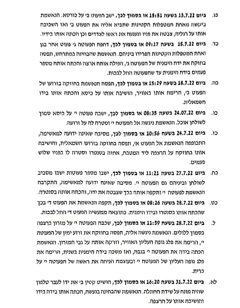 החשודה נצפתה ב-14 אירועי אלימות כלפי שבעה ילדים. דוחפת ילדים למזרן בצורה אגרסיבית, מרימה ילד כמו בובה ומטיחה אותו על המזרן. ילד רץ אליה והיא נותנת לו מכה בפנים.