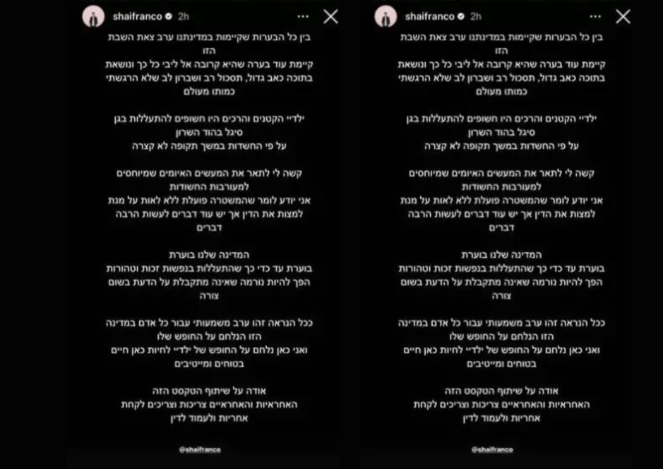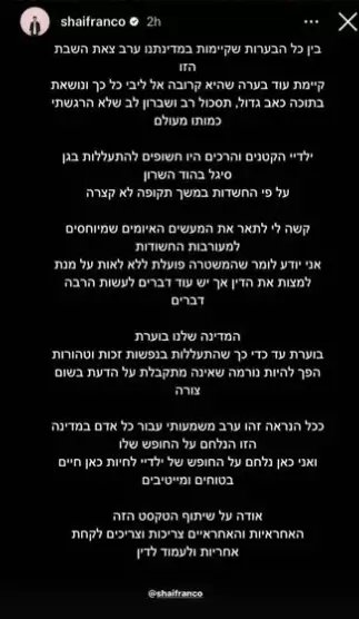 "בין כל הבערות שקיימות במדינתנו ערב צאת השבת הזו, קיימת עוד בערה שהיא קרובה אל לבי כל כך ונושאת בתוכה כאב גדול, תסכול רב ושברון לב שלא הרגשתי כמותו מעולם", כתב פרנקו בסטורי שובר לב, "ילדיי הקטנים והרכים היו חשופים להתעללות בגן סיגל בהוד השרון, על פי החשדות, במשך תקופה לא קצרה".